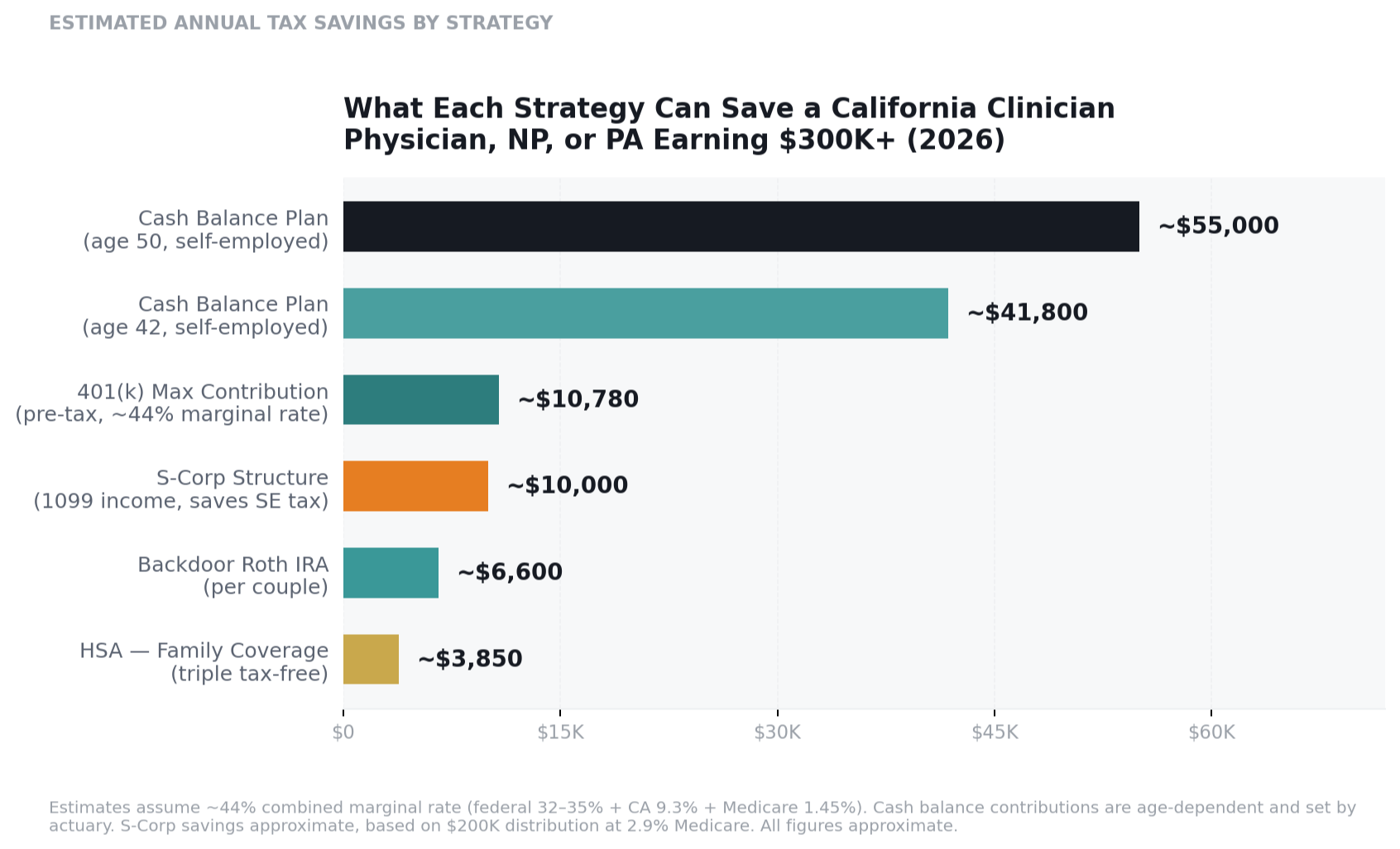 California clinicians earning $300K+ can face combined marginal rates above 44%. Most are leaving $20,000–$50,000 in avoidable taxes on the table every year — not because they're not smart, but because nobody's connected the dots yet. Here's what the strategies that actually move the needle look like in your 30s and 40s.