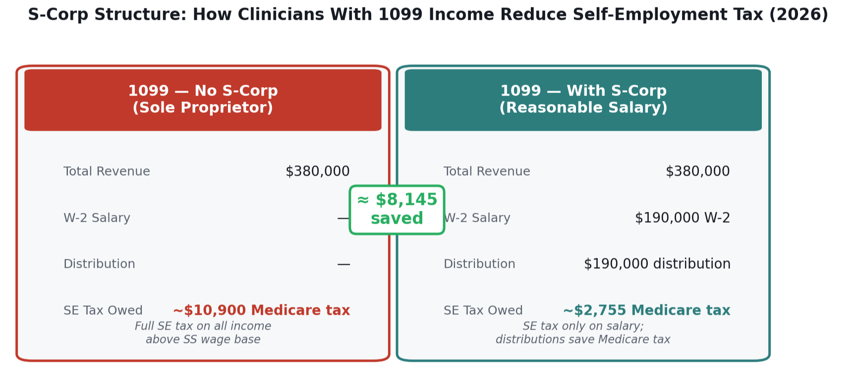 If you receive any meaningful 1099 income — and a lot of California physicians do, whether from locums work, telemedicine, expert witness consulting, or a side practice — the S-corp structure is worth evaluating seriously once that income exceeds roughly $100,000 per year.