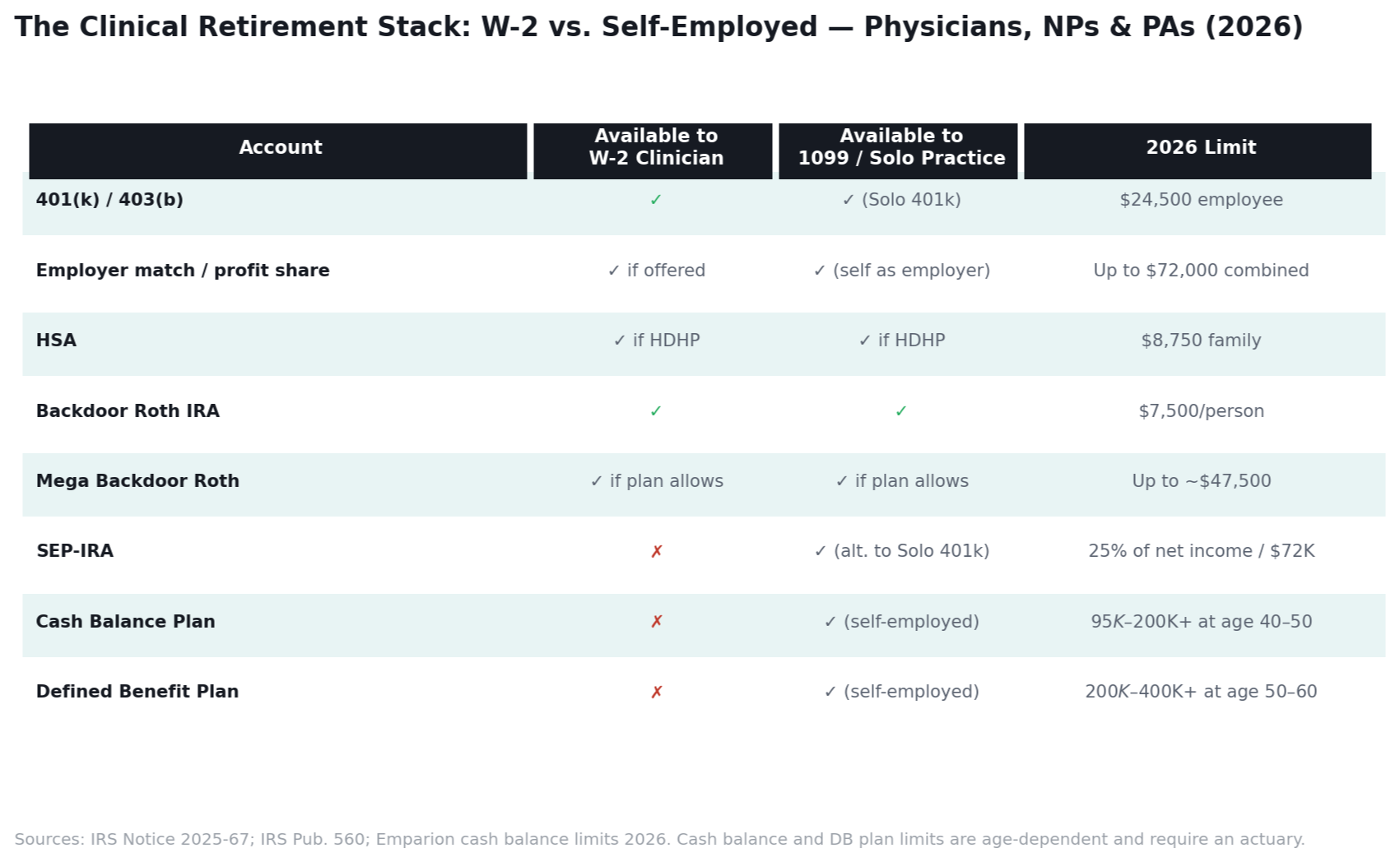 If you receive 1099 income — from your own practice, locums work, telemedicine contracts, consulting — you have access to retirement vehicles that W-2 employees simply don't get. This is one of the underappreciated financial advantages of independent practice.