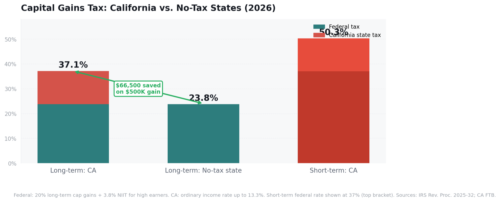 For a California high earner in the top federal bracket, that produces a combined long-term capital gains rate of 23.8% federal + 13.3% California = 37.1%. The same sale in Florida, Nevada, or Texas would cost 23.8% — just the federal rate, because those states have no income tax. On a $500,000 gain, that difference is $66,500 — enough to fund a Solo 401(k) twice over.