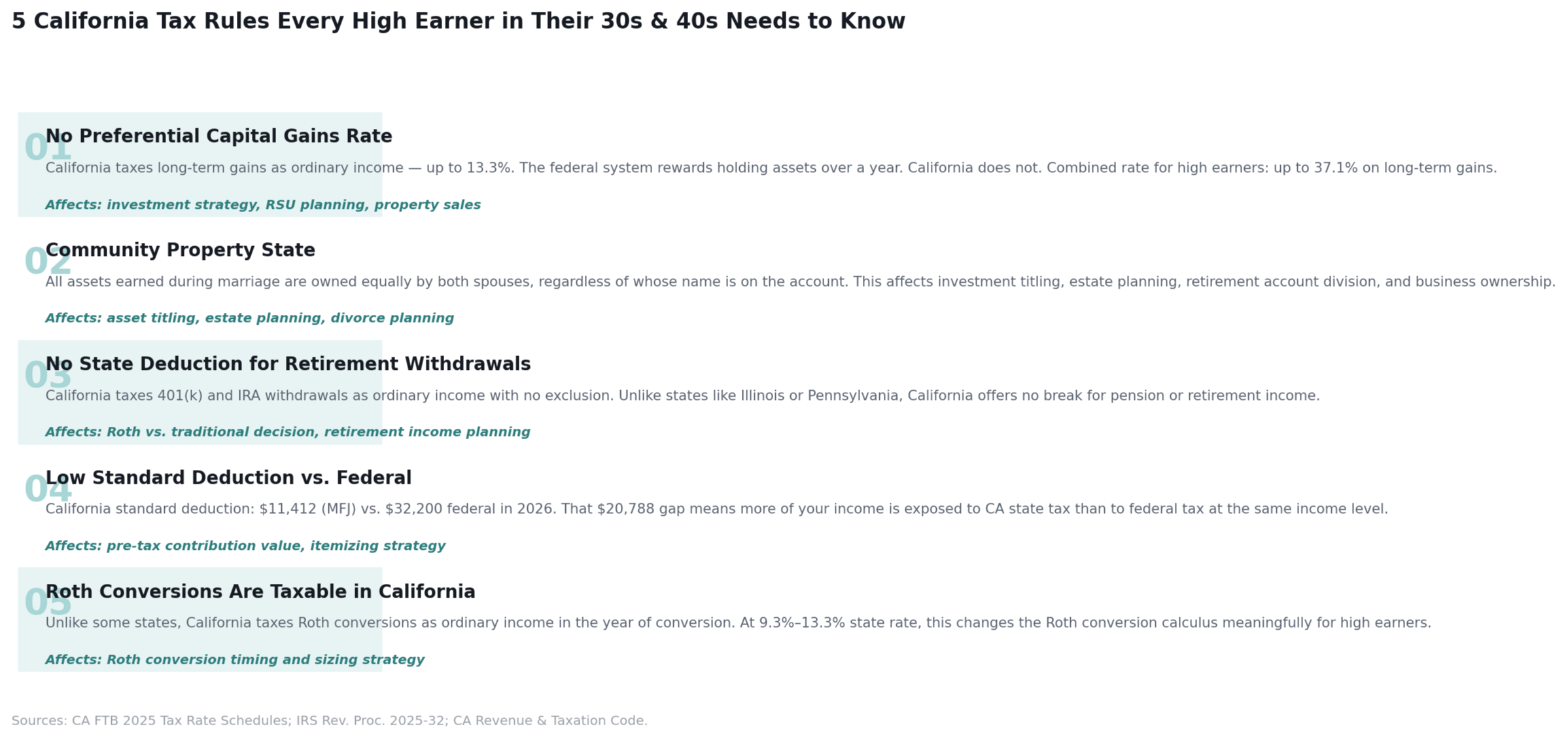 California taxes capital gains as ordinary income — no preferential rate. Combined with federal rates, earners over $300K can face a marginal rate above 44%. Here's what that means for your financial plan, and the five California-specific rules that should be shaping your strategy right now.